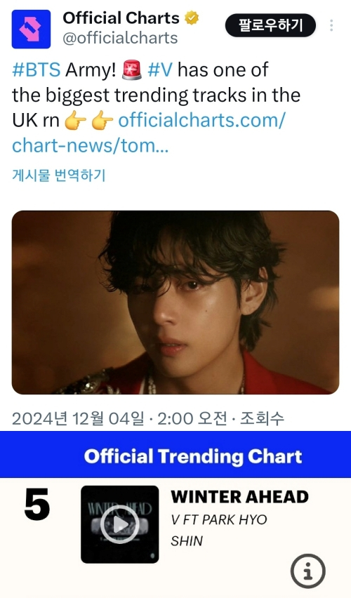 방탄소년단(BTS) 뷔의 디지털 싱글 'Winter Ahead'(with PARK HYO SHIN)가 영국 '오피셜 트렌딩 차트'에서 톱5에 오르며 글로벌 인기를 빛냈다.