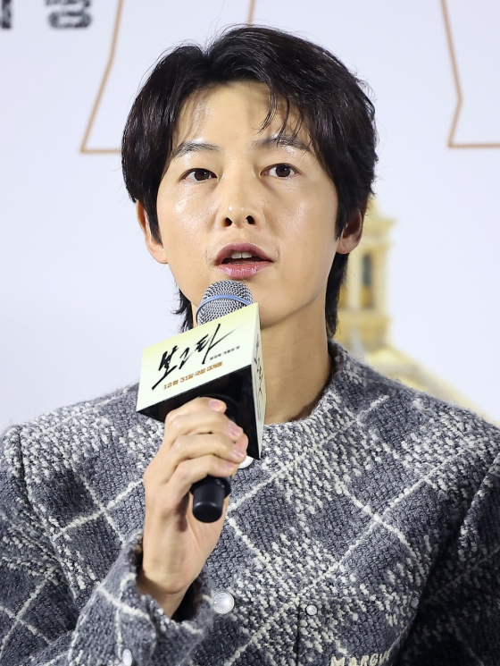 (서울=뉴스1) 김진환 기자 = 배우 송중기가 6일 서울 강남구 메가박스 코엑스에서 열린 영화 '보고타 : 마지막 기회의 땅' 제작보고회에 참석해 인사말을 하고 있다. '보고타 : 마지막 기회의 땅'은 IMF 직후, 새로운 희망을 품고 지구 반대편 콜롬비아 보고타로 향한 국희(송중기 분)가 보고타 한인 사회의 실세 수영(이희준 분), 박병장(권해효 분)과 얽히게 되면서 벌어지는 이야기를 그린 영화다. 2024.12.6/뉴스1 Copyright (C) 뉴스1. All rights reserved. 무단 전재 및 재배포, AI학습 이용 금지. /사진=(서울=뉴스1) 김진환 기자