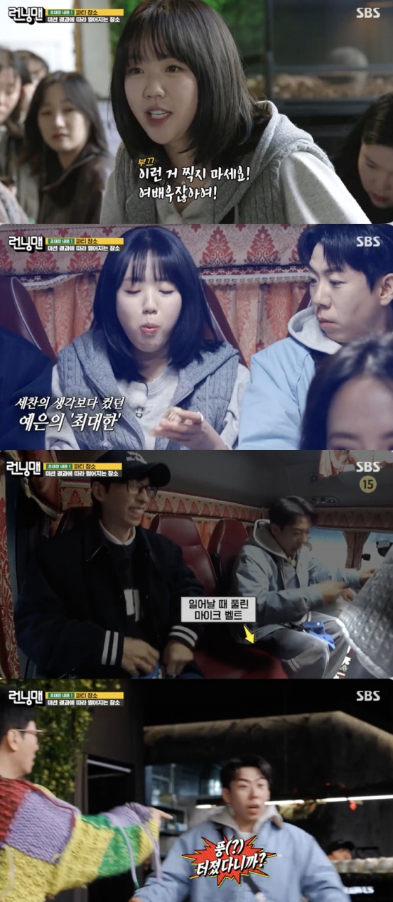 이후 도착 장소에 다다른 지예은이 버스에서 하차할 때 그의 마이크 벨트가 풀리는 사고가 발생했다. 이를 본 양세찬은 "얘 많이 먹어서 마이크 벨트가 풀린 것. 풍 하고 터졌다"라고 지적했다. 지석진 역시 "이 벨트는 잘 안 풀리는데.."라며 놀란 모습을 보였다.