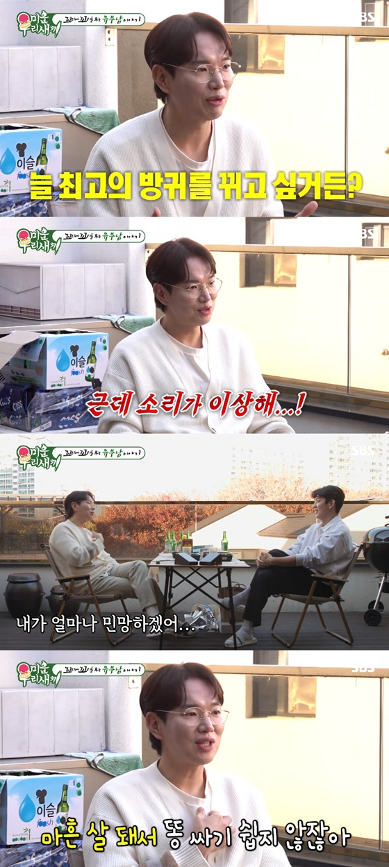 장성규는 이용대에게 "내가 얼마나 민망했겠냐. 마흔 살 돼서 똥 싸기 쉽지 않지 않냐. 그런데 아내가 '오늘 대장내시경 처음 해서 그래. 많이도 안 했네'라며 물티슈로 닦아 줬다"며 "나 그때 정말 감동받았다"고 말했다.