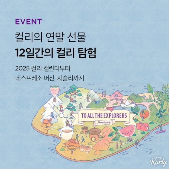 총 3,000명에게는 2025년 한정판 컬리 캘린더도 선물한다. 이번 캘린더는 풍경의 아름다움을 섬세하게 그려내는 일러스트레이터 정다은 작가와 협업했다. 컬리 감성에 어울리는 따뜻한 색채와 간결한 선이 특징으로 동화를 연상케 하는 일러스트 12장을 엽서로도 사용할 수 있다.