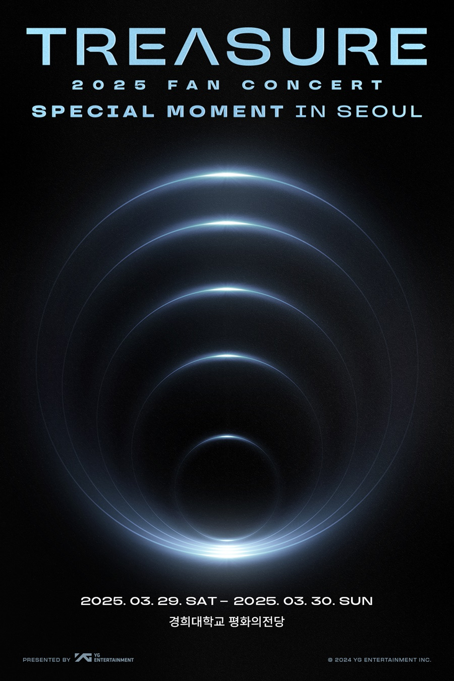 9일 YG엔터테인먼트에 따르면 트레저는 내년 3월 29일, 3월 30일 서울 경희대학교 평화의 전당에서 '2025 TREASURE FAN CONCERT [SPECIAL MOMENT] IN SEOUL'을 개최한다. 2021년 10월 [TEU-DAY] 이후 약 3년 5개월 만의 한국 팬 콘서트를 확정한 것.