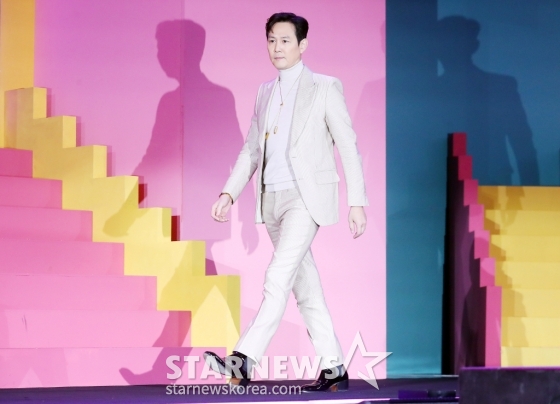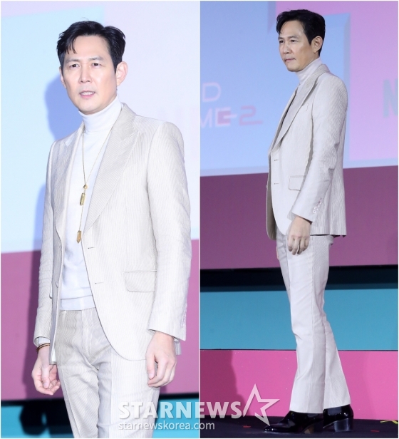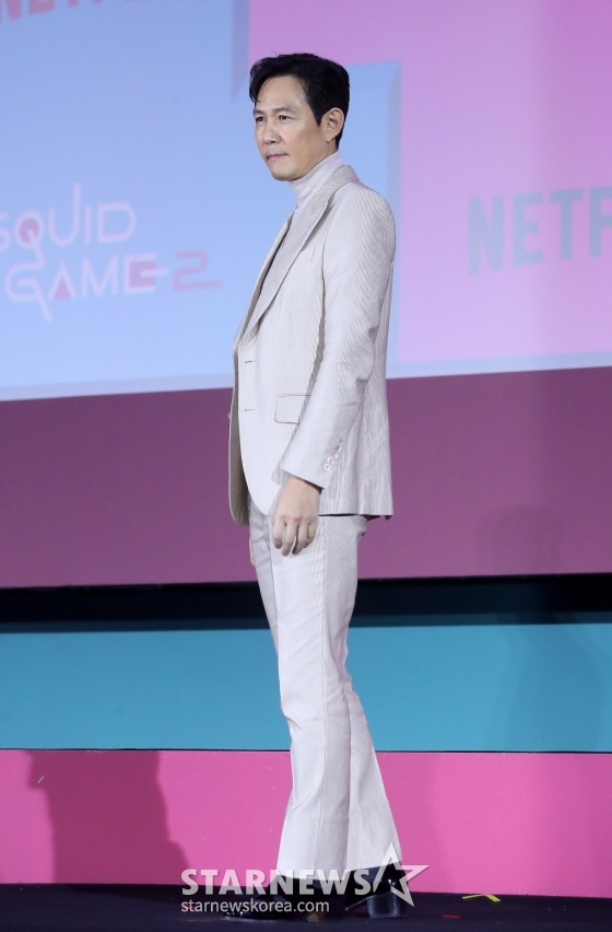 배우 이정재가 9일 오전 서울 중구 동대문디자인플라자에서 진행된 넷플릭스 시리즈 '오징어 게임 시즌2' 제작발표회에 참석해 포즈를 취하고 있다.