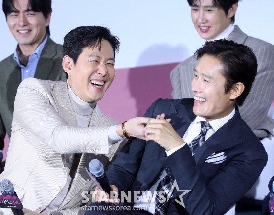 배우 이정재, 이병헌이 9일 오전 서울 중구 동대문디자인플라자에서 진행된 넷플릭스 시리즈 '오징어 게임 시즌2' 제작발표회에서 대화를 나누고 있다.