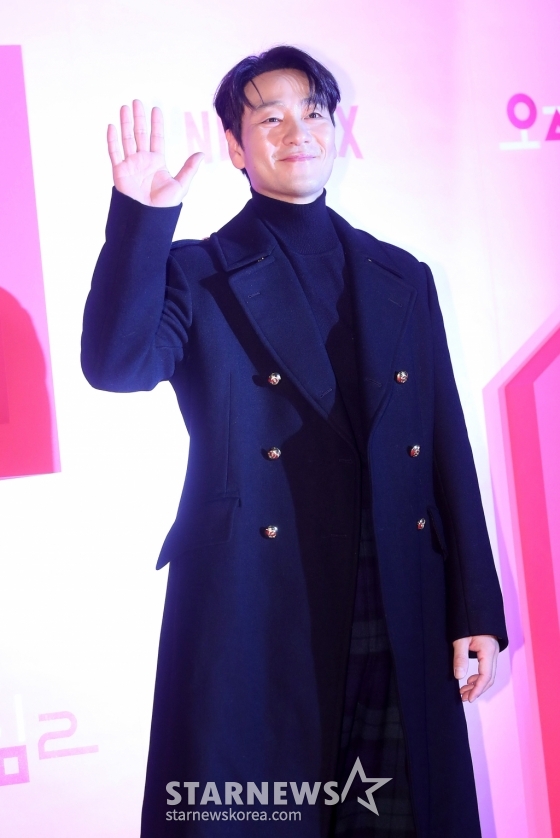 배우 박해수가 9일 오후 서울 중구 동대문디자인플라자에서 진행된 넷플릭스 시리즈 '오징어 게임 시즌2' 핑크카펫에 참석해 포즈를 취하고 있다.