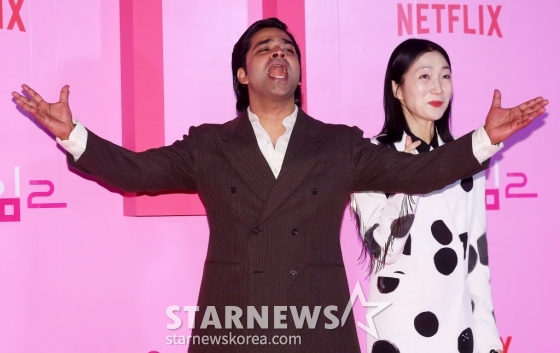 배우 야누팜, 김주령이 9일 오후 서울 중구 동대문디자인플라자에서 진행된 넷플릭스 시리즈 '오징어 게임 시즌2' 핑크카펫에 참석해 포즈를 취하고 있다.