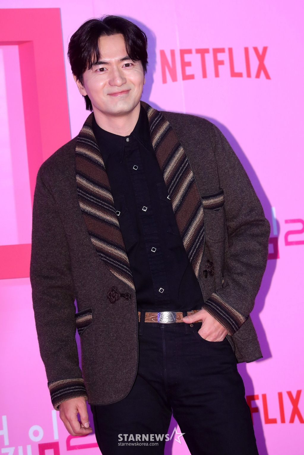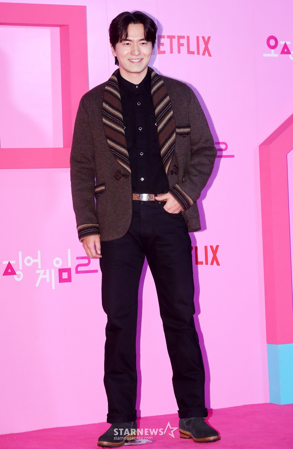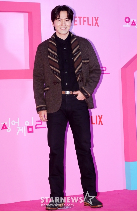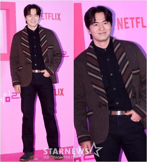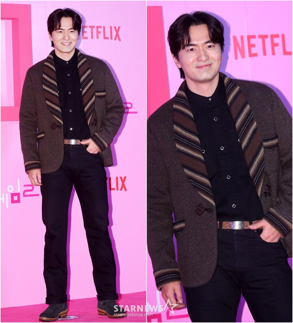배우 이진욱이 9일 오후 서울 중구 동대문디자인플라자에서 진행된 넷플릭스 시리즈 '오징어 게임 시즌2' 핑크카펫에 참석해 포즈를 취하고 있다.