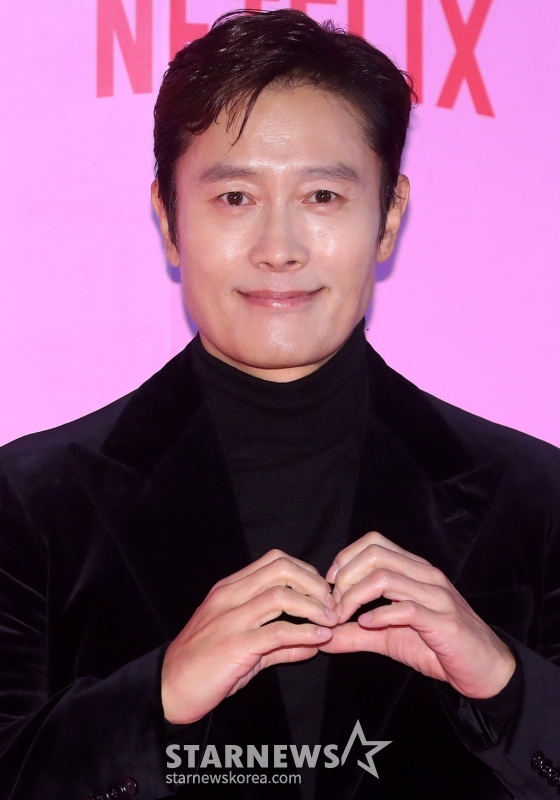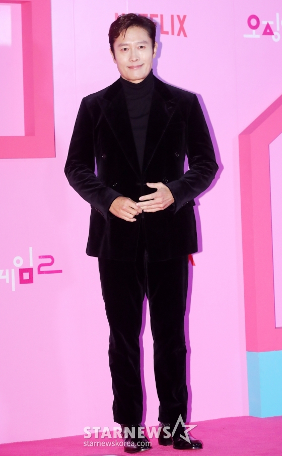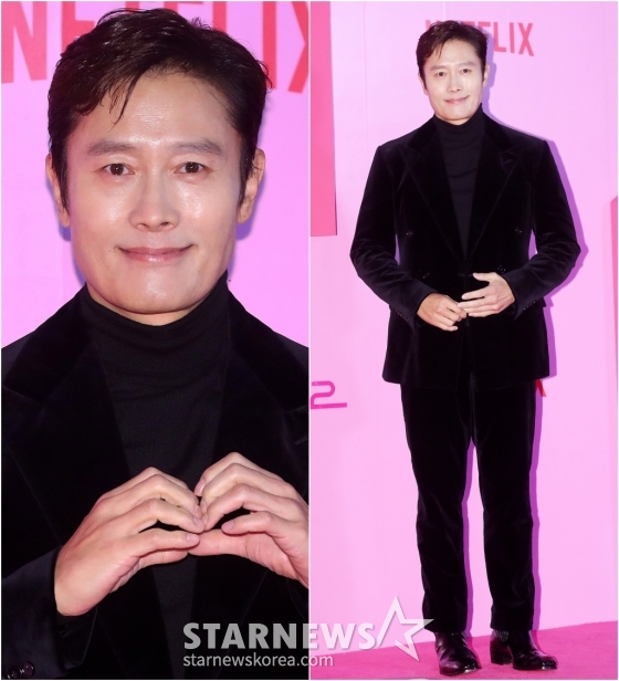 배우 이병헌이 9일 오후 서울 중구 동대문디자인플라자에서 진행된 넷플릭스 시리즈 '오징어 게임 시즌2' 핑크카펫에 참석해 포즈를 취하고 있다.