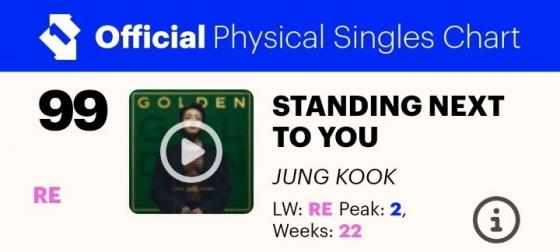 미국 빌보드(Billboard)와 함께 세계 양대 차트로 꼽히는 영국 오피셜(UK Official)이 공개한 최신 차트(12월 6일~12일 자)에 따르면, 정국의 솔로곡 'Standing Next to You' '오피셜 피지컬 싱글 차트' 99위로 재진입했다.