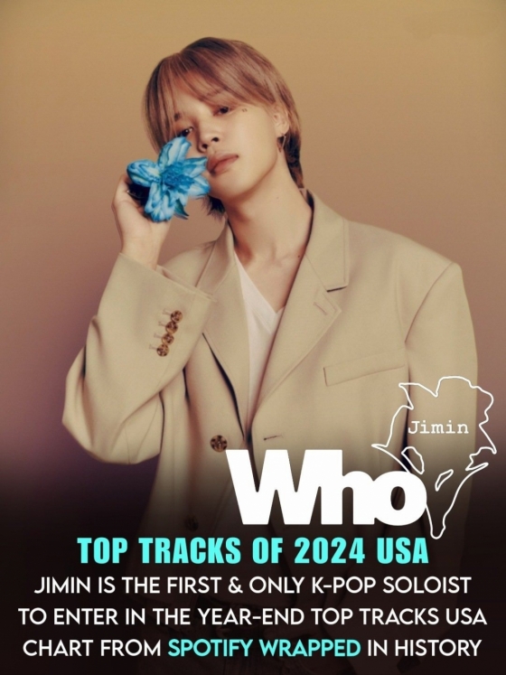 지민의 솔로 2집 'MUSE'(뮤즈) 타이틀곡 'Who'(후)는 미국 스포티파이 랩드 연말결산 'Top Tracks of 2024 USA' 리스트 46위에 랭크됐다. 역대 한국 솔로 가수 노래 중 첫 진입 기록이다.