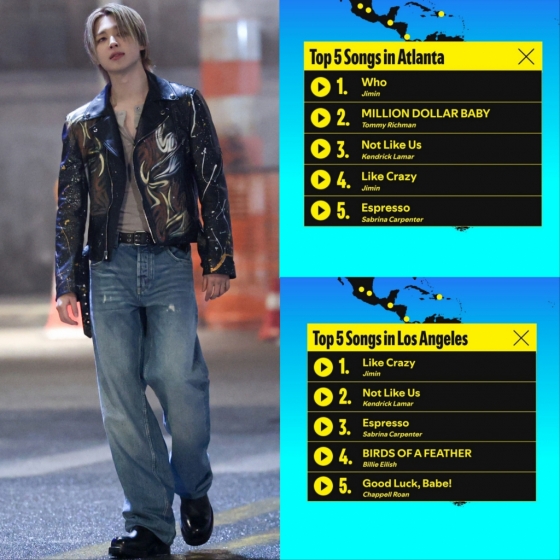 2024년에는 애틀랜타 차트에서 지민의 '후'가 1위에 오른 데 이어 '라이크 크레이지'가 4위에 랭크되면서 지민은 2년 연속 해당 도시 차트에 차트인 했다.