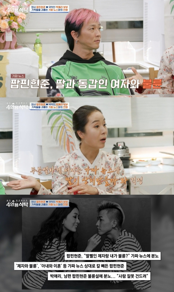 팝핀현준은 "나에 대한 가짜뉴스가 정말 많다"라고 하자, 박애리는 "여러 개가 있는데 다른 건 웃어넘겼다. 근데 팝핀현준이 불륜하는데 상대가 딸과 동갑이라는 말이 있었다. 이건 웃어넘길 수 없겠더라"라며 "우리는 이혼 준비 중이고 별거 중이라고 했다. 그래서 딸이 좋지 않은 선택을 했다고 했다. 딸이 중학교 1학년인데 그런 영상은 불특정 다수에게 퍼질 수 있다. 그래서 마포경찰서에 고소해서 수사 중이다. 그거 때문에 온 가족이 힘들었다"라고 털어놨다.