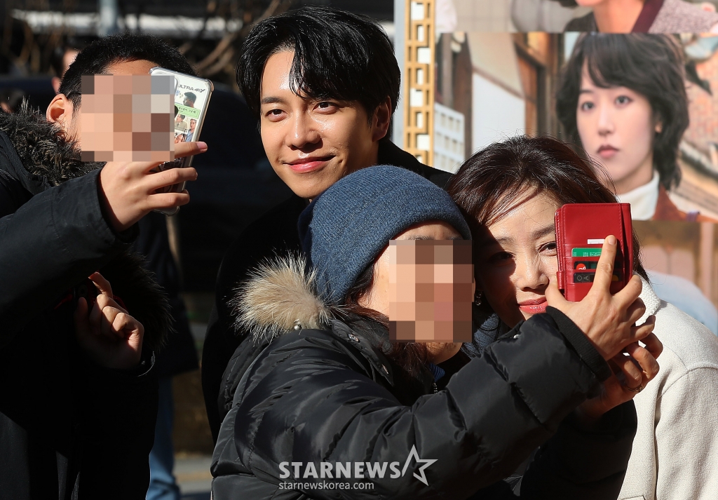배우 이승기, 김성령이 10일 오후 서울 중구 한국프레스센터 앞 광장에서 진행된 영화 '대가족' 만두트럭 이벤트 행사에서 팬과 사진 촬영을 하고 있다.