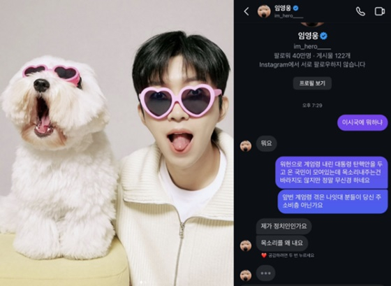 이러한 시국 속 임영웅은 한 네티즌으로부터 "이 시국에 뭐하냐"라는 DM을 받고 "뭐요"라고 대답했다. 이 네티즌이 "위헌으로 계엄령 내린 대통령 탄핵안을 두고 온 국민이 모여있는데 목소리 내주는 건 바라지도 않지만 정말 무신경하네요. 앞번 계엄령 겪은 나잇대 분들이 당신 주 소비층 아닌가요"라고 지적하자 임영웅은 "제가 정치인인가요. 목소리를 왜 내요"라고 답해 논란이 일었다.