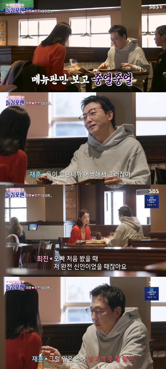 식당에서 데이트를 하게 된 두 사람은 단둘의 시간에 어색해했다. 특히 탁재훈은 장희진이 힐끔 쳐다보자 부끄러워했다.