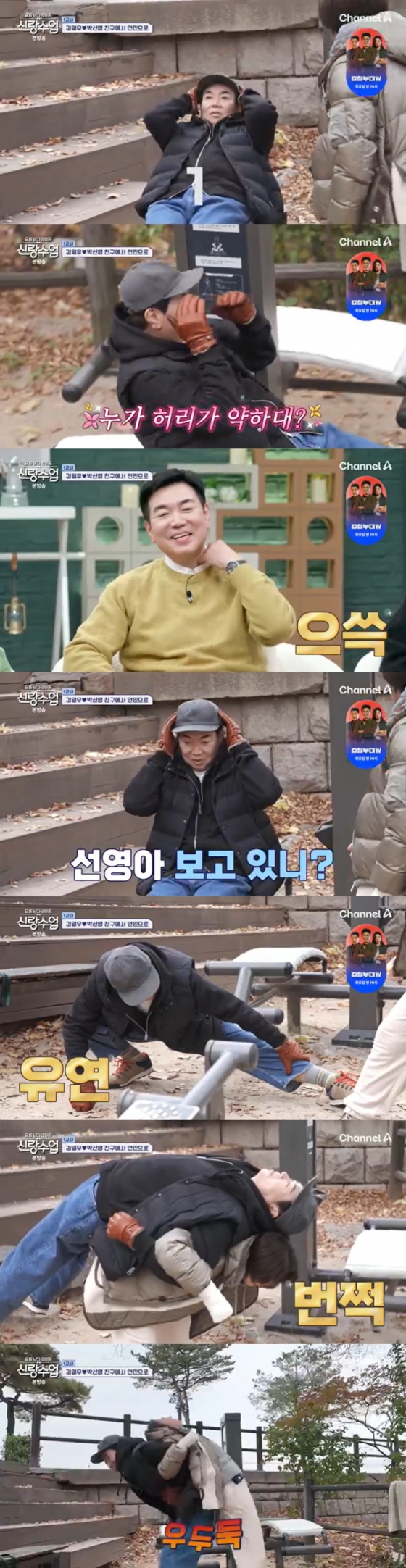 두 사람이 산에 있는 헬스장을 발견한 순간 김일우는 돌연 허리를 돌리며 허리 건강을 자랑했다.