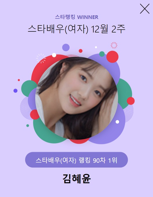 김혜윤은 지난 12월 5일 오후 3시 1분부터 12월 12일 오후 3시까지 진행된 12월 2주(90차) 스타랭킹 스타배우 여자 랭킹 투표에서 2만 2840표를 얻어 1위에 올랐다.