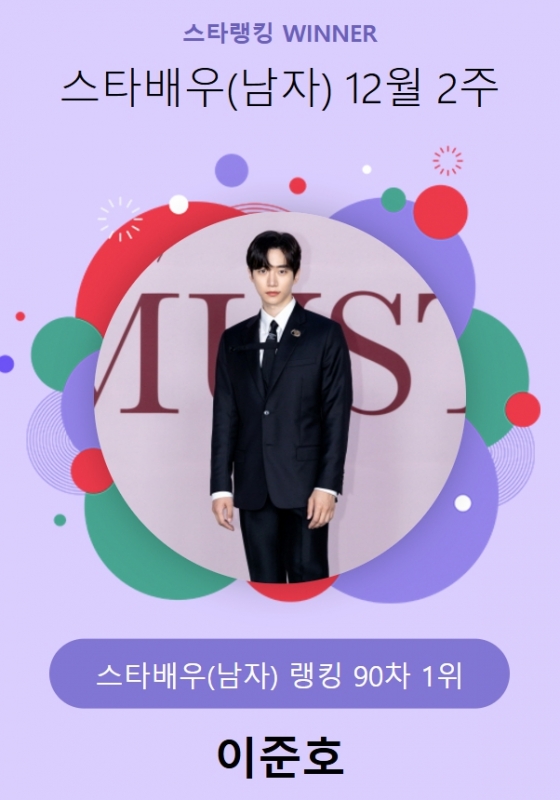 이준호는 지난 5일 오후 3시 1분부터 12일 오후 3시까지 진행된 12월 2주(90차) 스타랭킹 스타배우 남자 랭킹 투표에서 변우석, 김남길을 꺾고 1위를 차지했다.