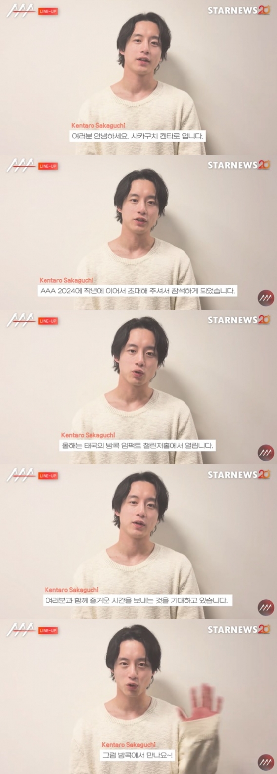 'AAA 2024' 참석 소식만으로도 전 세계 팬들의 기대감을 높인 사카구치 켄타로. 하지만 아직 놀라기엔 이르다. 그는 12일 'AAA' 공식 유튜브 채널을 통해 "'2024 AAA'에 작년에 이어서 초대해 주셔서 참석하게 됐다. 올해는 태국의 방콕 임팩트 챌린저홀에서 열린다. 여러분과 함께 즐거운 시간을 보낼 것을 기대하고 있다"라는 메시지가 담긴 동영상을 공개했다.