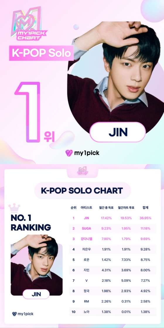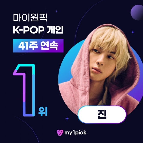 방탄소년단(BTS) 진이 마이원픽(MY1PICK)에서 주간랭킹과 월간차트에서 우승을 차지하며 인기를 빛냈다.