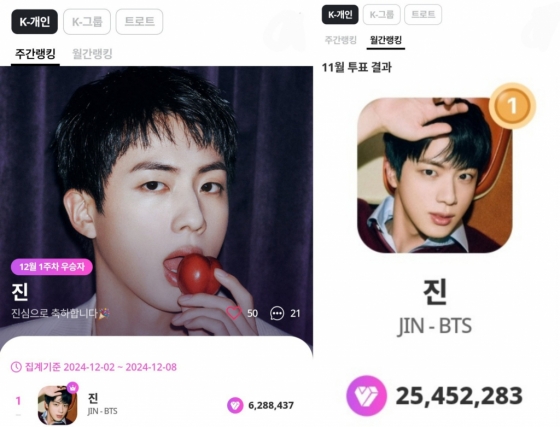 진은 마이원픽 'K-POP 개인 부문 주간랭킹' 12월 1주차(12월 2일~12월 8일) 투표에서 628만 8437개의 하트를 얻어 압도적인 표수로 1위에 올랐다.