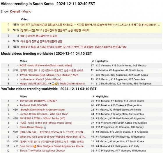 유튜브 韓 인기 동영상 톱2·전 세계 MV 인기 동영상 톱2·전 세계 인기 동영상 톱10