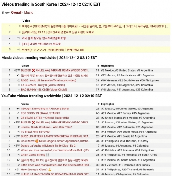 진의 '달려라 석진'은 11일에 이어 12일에도 유튜브 한국 인기 동영상 2위, 전 세계 뮤직비디오 인기 동영상 2위, 전 세계 인기 동영상 12위를 차지하며 여전히 뜨거운 인기를 이어갔다.