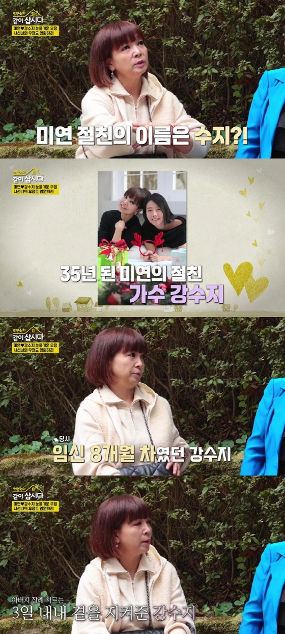 원미연은 두 사람을 보고, 절친한 강수지가 떠오른다며 입을 열었다. 그는 "강수지와 친하게 지낸 지 35년 정도 됐다. 아버지가 중환자실에 계셨고, 제가 9일 동안 거기서 먹고 잤다. 당시 (강) 수지가 임신 8개월 차였는데 병원에 찾아와서 각종 음식을 가져다줬다"고 밝혔다.