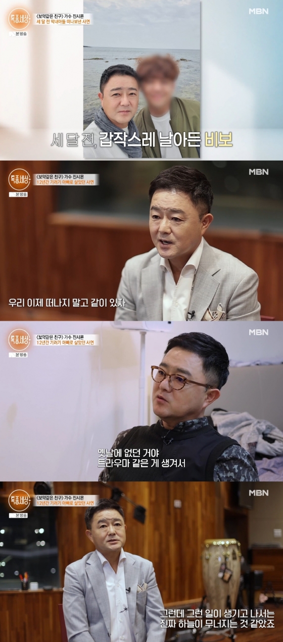 진시몬은 1년 전부터 30년 지기 곽창선과 듀엣으로 활동하고 있다고. 한동안 목소리가 나오지 않았다는 진시몬은 곽창선 덕분에 다시 마이크를 잡았다고 한다. 곽창선은 "장례식 치르고 스케줄 소화하는 거 보면서 저도 남자로서, 아빠로서 많이 안타까웠는데 지금은 형이 많이 기운 차리고, 다시 예전 모습으로 돌아와 줘서 너무 고맙다"고 전했다.