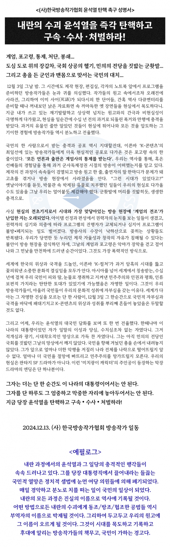 방송작가협회는 13일 공식 홈페이지를 통해 "내란의 수괴 윤석열을 즉각 탄핵하고 구속·수사·처벌하라"란 제목의 윤석열 탄핵 촉구 성명서를 냈다.