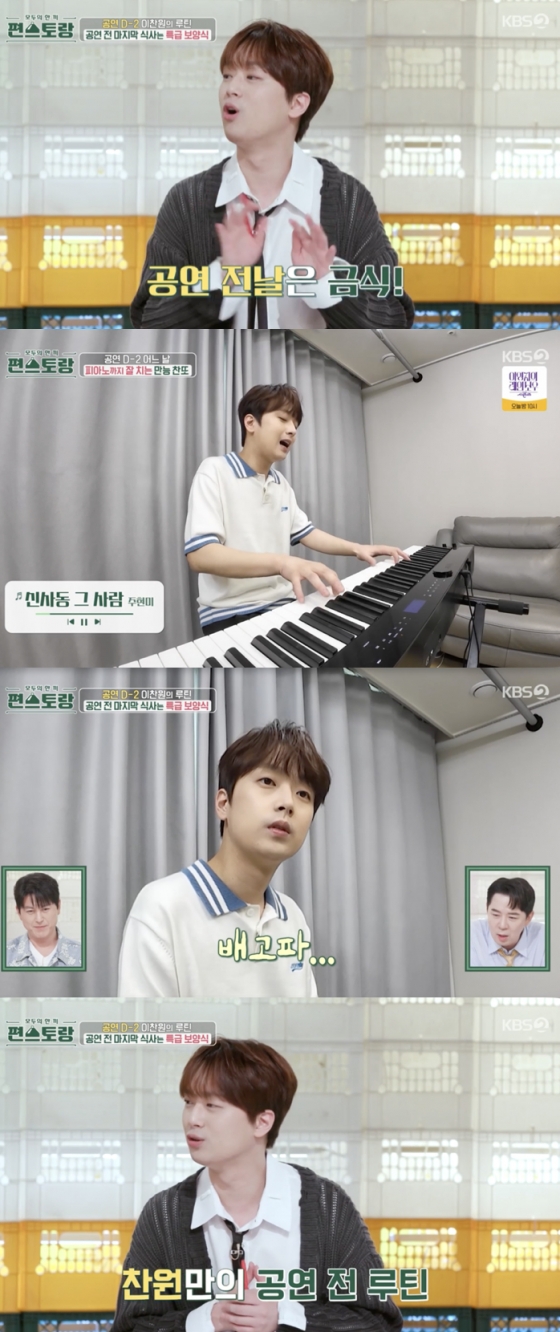 '신상 출시 편스토랑'에서 트로트 가수 이찬원이 자신만의 공연 전 루틴을 공개했다.