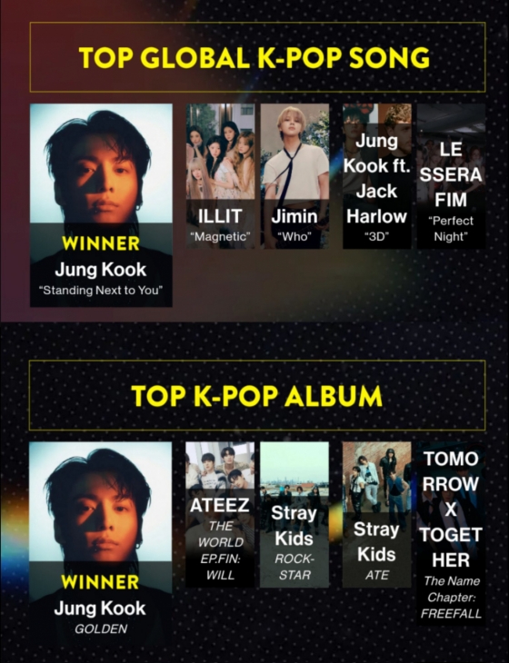지난해 'BBMAs'에서 자신의 첫 솔로 싱글 'Seven'(세븐)으로 '톱 글로벌 K-팝 송'을 수상한 정국은 솔로 활동으로 'BBMAs'에서 '2년 연속' 수상하는 영광을 누렸다.