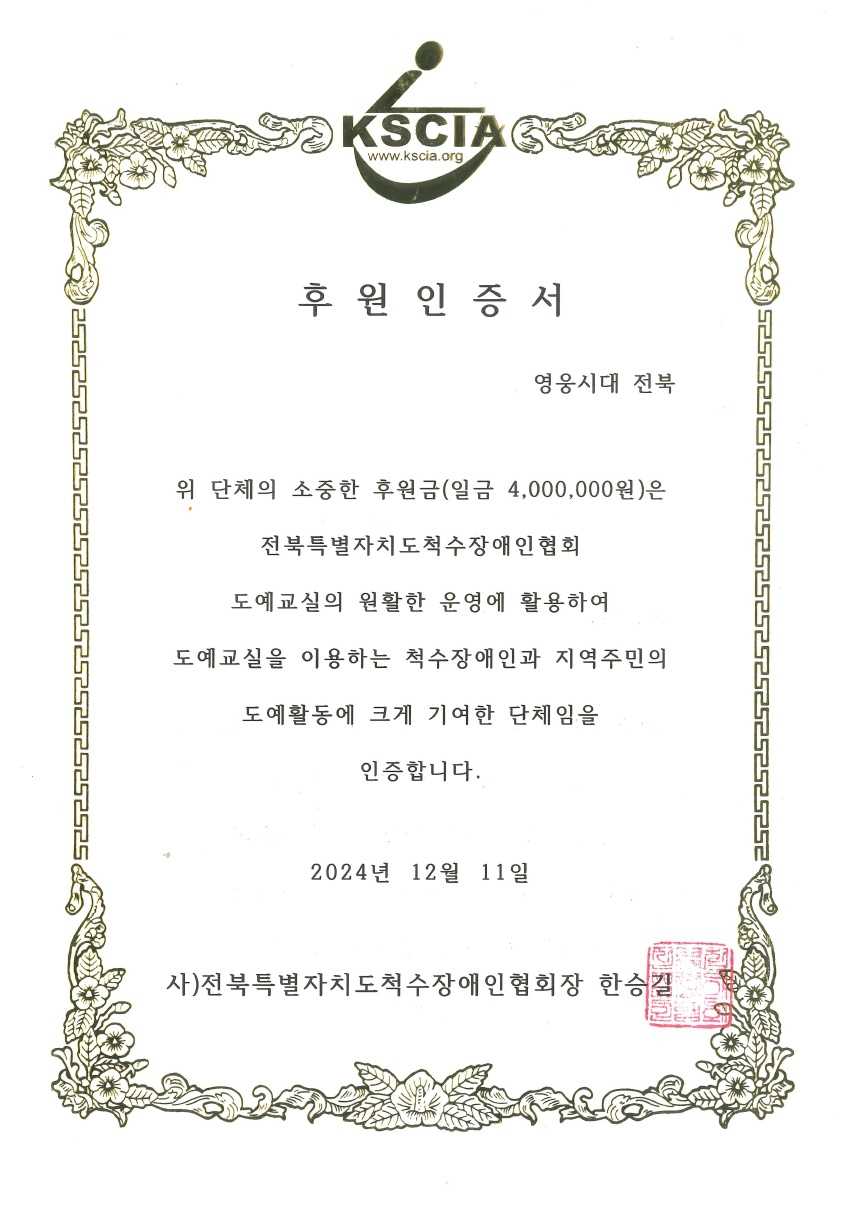 '영웅시대 전북'은 2022년부터 전북특별자치도척수장애인협회를 세 번째 후원하며 인연을 이어오고 있다.