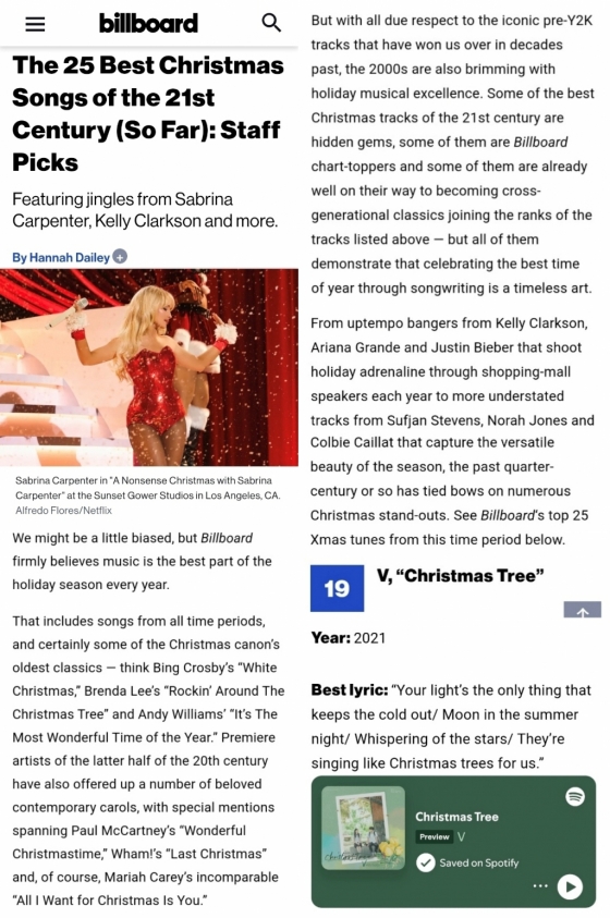 방탄소년단(BTS) 뷔의 솔로곡 '크리스마스 트리'(Christmas Tree)가 빌보드 '21세기 최고의 크리스마스 곡 25'에 선정됐다.