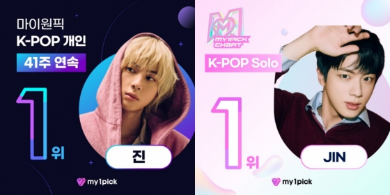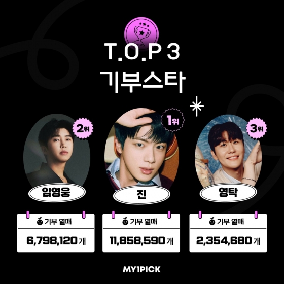 방탄소년단(BTS) 진이 마이원픽(MY1PICK)에서 기부 스타 1위에 오르며 선한 영향력을 펼쳤다.