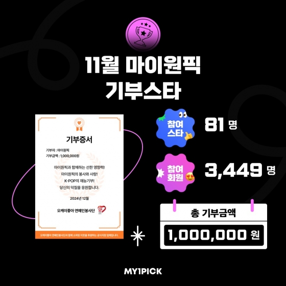 진은 마이원픽에서 기부 열매 1185만 8590개를 모아 '11월 마이원픽 기부스타' 1위로 등극했다.