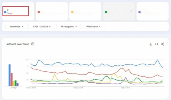 구글 트렌드(Google Trends)에 따르면 뷔는 2024년 최다 검색량을 기록한 K팝 스타에 등극했다. 구글 트렌드는 여러 지역과 언어로 검색 쿼리의 인기도를 분석하는 구글의 웹사이트이다.