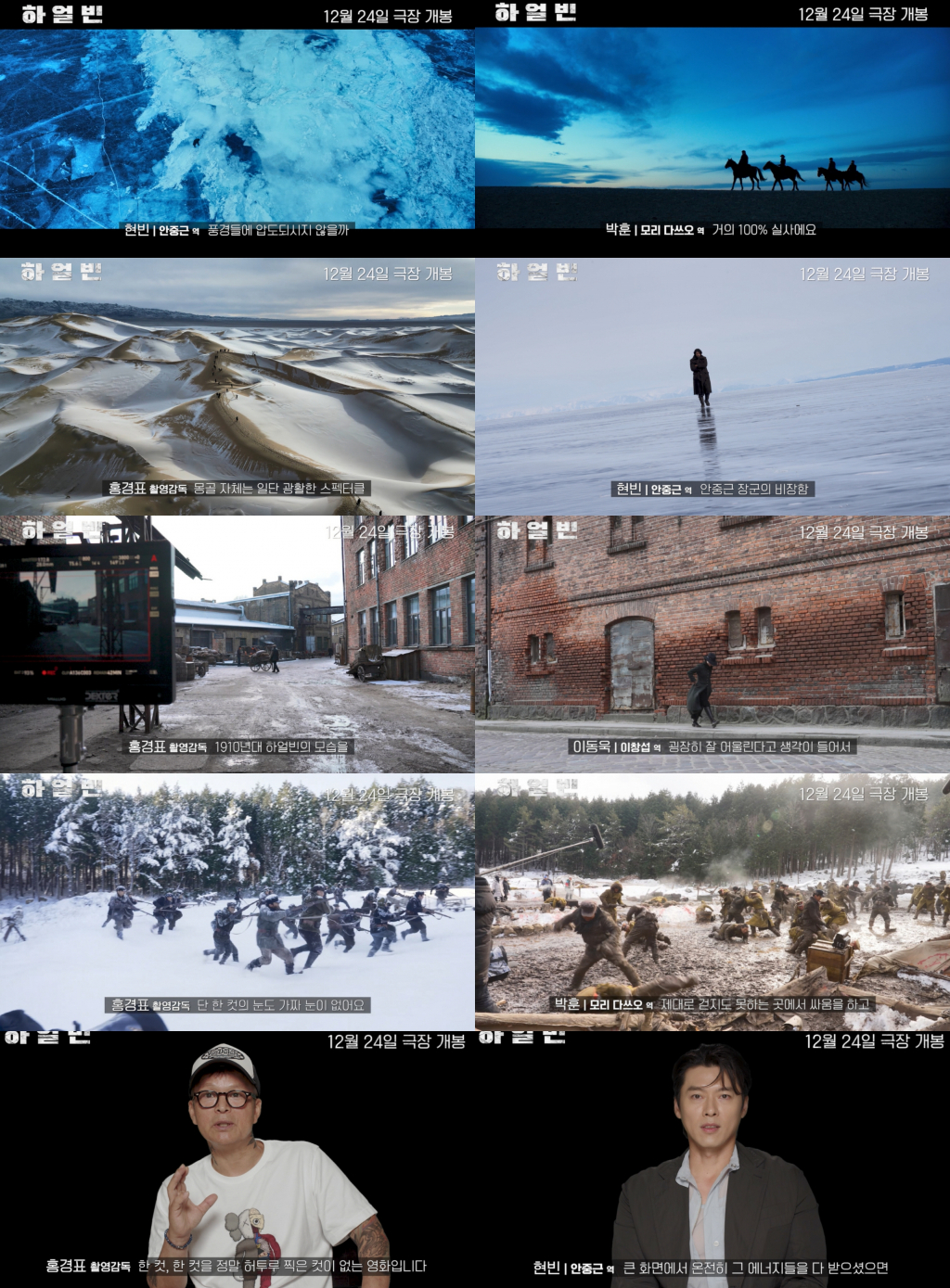 올겨울 극장가를 압도할 영화 '하얼빈'이 몽골, 라트비아, 대한민국에 이르기까지 험난한 여정을 경험한 배우, 감독, 스탭들의 이야기가 담긴 '하나의 목표, 3개국 로케이션' 영상을 공개했다. 공개된 영상에서는 스크린에 담길 광활하고도 웅장한 자연의 모습과 대한민국 최고 제작진이 선사하는 프로덕션을 확인할 수 있다. 안중근 장군 역의 현빈은 "영화관에서 큰 스크린으로 보면 아마 압도될 것"이라며 영상의 포문을 열었다. 모리 다쓰오 역의 박훈은 "CG가 멋있다는 말이 있는데 '하얼빈'은 실사"라며 100% 리얼리티에 도전한 촬영 현장을 설명했다.