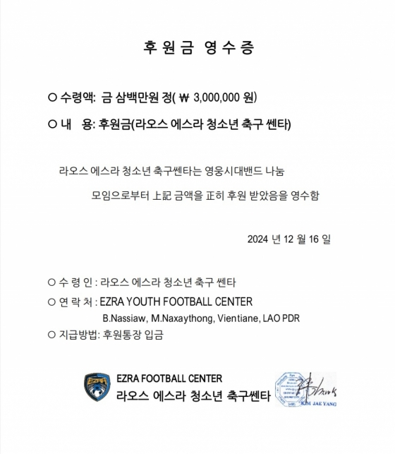 영웅시대밴드(나눔모임)은 "특별히 2024년 연말을 맞아 라오스의 열악한 여건과 시설에서 축구를 통하여 자신의 미래를 꿈꾸어 가는 라오스 유·청소년들에게 힘이 되어 주고자 하는 마음에서 후원금을 전달한다"며 "후원금이 꼭 필요한 곳에 유익히게 사용되기를 부탁드린다"고 전했다.