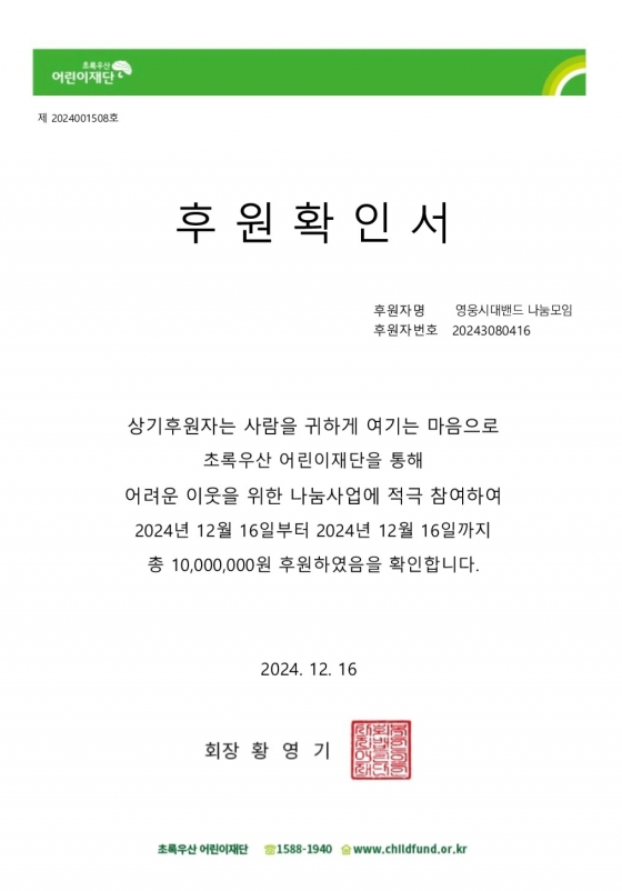 임영웅 팬클럽 영웅시대밴드(나눔모임)은 12월 15일 초록우산 어린이재단을 통해 서울시 어린이병원(병원장 남민)에 발달장애 환아를 위한 기부금 1000만 원을 전달했다.