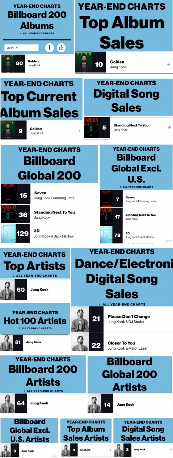 미국 음악 전문 매체 빌보드가 발표한 '2024년 결산 차트'(Year-End Charts)에 따르면, 메인 앨범 차트인 '빌보드 200'(Billboard 200)에서 정국의 첫 솔로 앨범 'GOLDEN'(골든)이 80위를 비롯해 '톱 앨범 세일즈'(Top Album Sales) 10위, '톱 커런트 앨범 세일즈'(Top Current Album Sales) 9위를 차지했다.