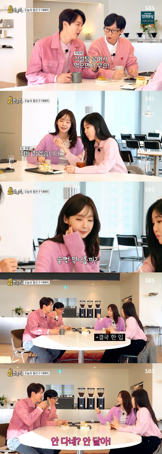 이어 케이크를 한 입 먹고는 "어머, 안 달다. 하나도 안 달다. 이거는 (혈당 스파이크가) 안 온다"며 호들갑을 떨어 웃음을 자아냈다.