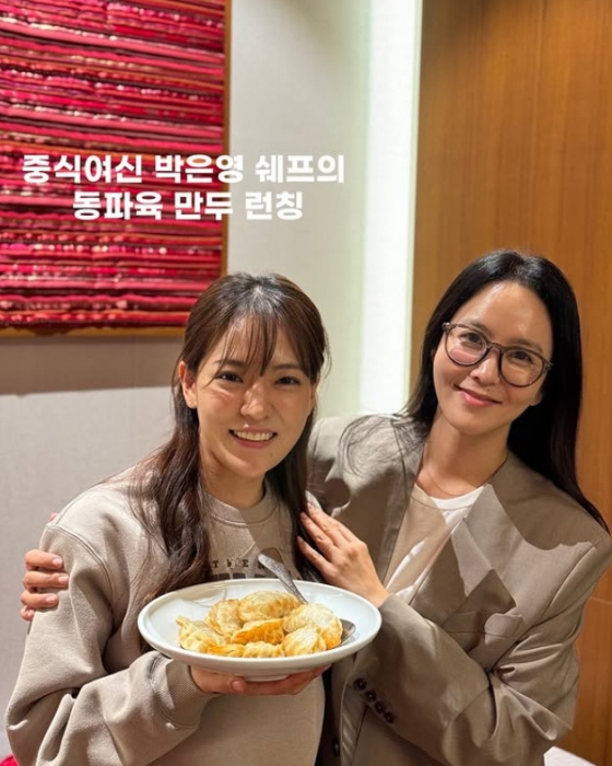 박은영 셰프는 '흑백요리사' 1라운드에서 동파육 만두를 선보여 합격한 바 있다. 특히 과거 MBC '놀면 뭐하니'에 출연해 방송인 유재석의 요리 스승으로도 알려진 그는 박지윤과 만나 해맑은 웃음을 짓고 있다.