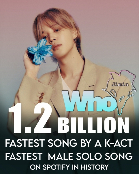 지민의 솔로 2집 'MUSE'(뮤즈) 타이틀곡 'Who'(후)는 12월 16일 스포티파에서 12억 스트리밍을 돌파했다. 발매 151일 만의 대기록이자 K팝 최단 기간 신기록이다.