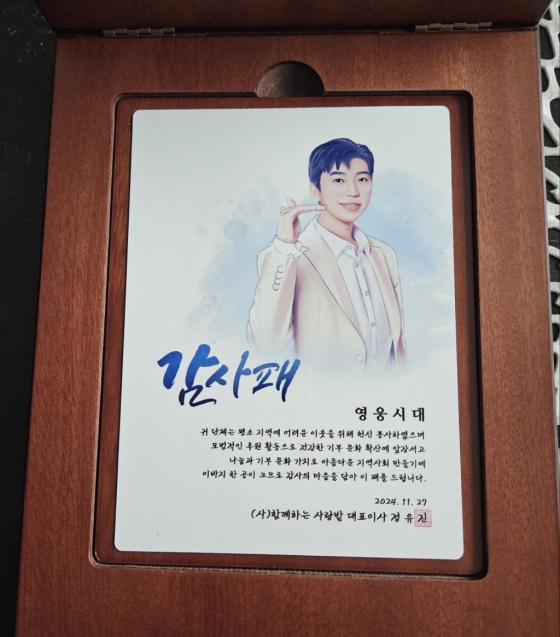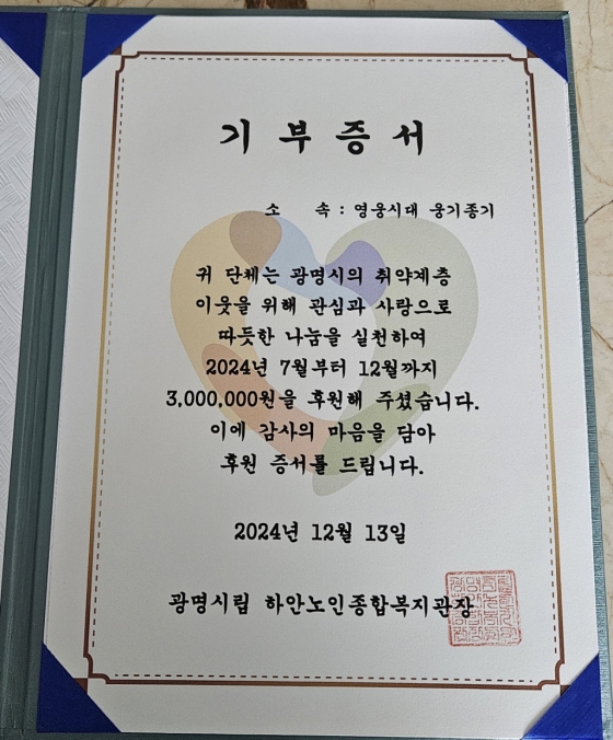 가수 임영웅 팬클럽 '웅기종기'가 4년 넘게 봉사하고 있는 광명하안노인복지관으로부터 후원증과 감사패를 받았다.