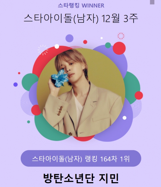 지민은 지난 12일 오후 3시 1분부터 19일 오후 3시까지 진행된 12월 3주(164차) 스타랭킹 스타아이돌 남자 랭킹 투표에서 3만4998표를 얻어 1위를 차지했다.