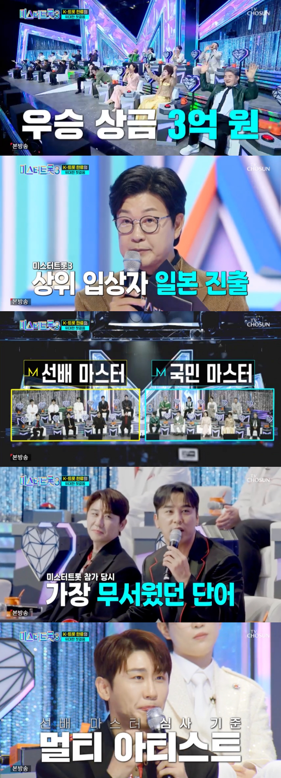 19일 첫 방송된 TV조선 예능 프로그램 '미스터트롯3'에서는 국민 마스터와 선배 마스터로 나뉜 심사위원들이 소회를 밝히는 모습이 그려졌다.