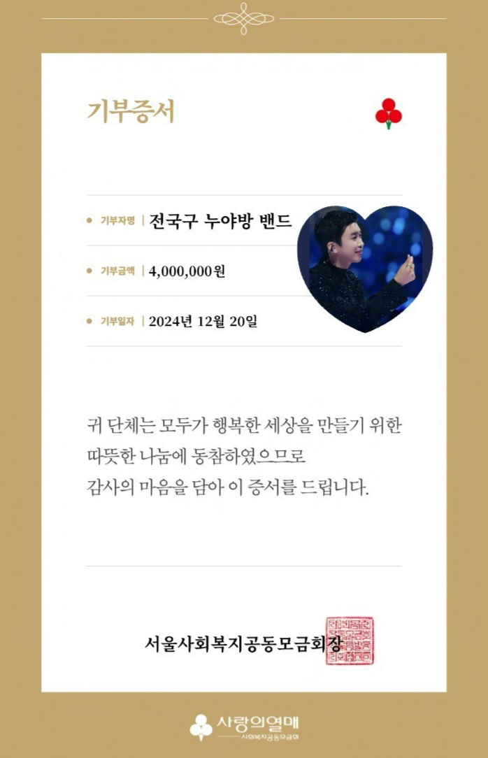 임영웅 팬클럽 영웅시대 전국구 누야방 밴드는 12월 20일 사랑의열매 서울사회복지공동모금회에 400만 원을 기부했다.