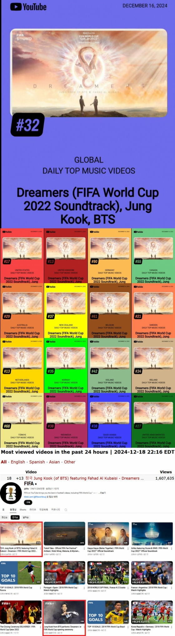 이에 정국이 가창한 '2022 FIFA 카타르 월드컵' 공식 사운드 트랙 'Dreamers' 뮤직비디오가 유튜브 16개 국가 '데일리 톱 뮤직비디오' 차트에 오르며 독보적인 글로벌 인기를 자랑했다.
