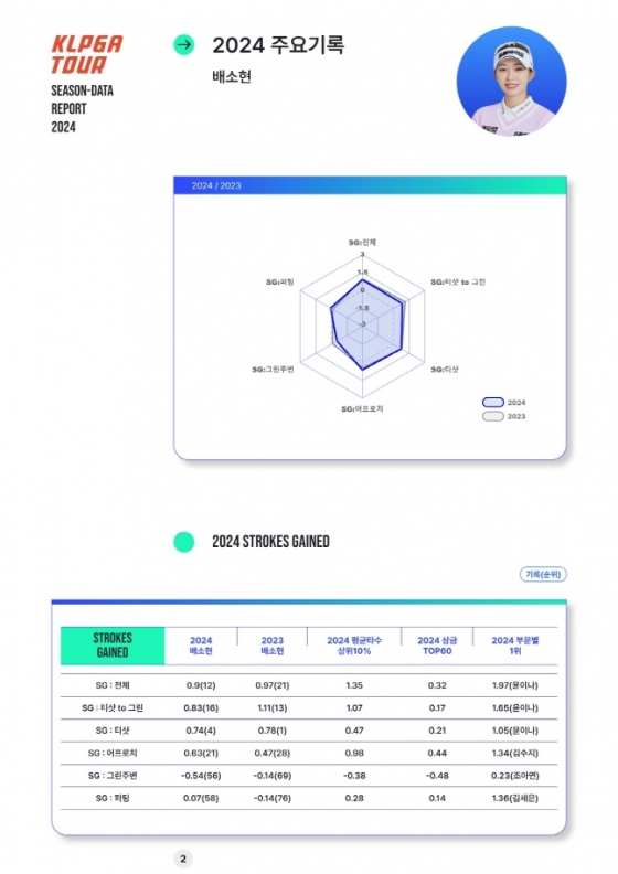 2024시즌 KLPGA투어에서 생애 첫 우승을 포함해 시즌 3승을 수확하며 공동 다승왕에 오른 배소현(31·프롬바이오)은 "데이터 리포트를 통해 올해 쇼트 퍼트가 좋아졌지만 그린주변 벙커 샷과 파 세이브율이 부족했다는 점을 쉽게 파악할 수 있었다"면서 "작년보다 페어웨이 적중률도 떨어졌는데, 아이언 샷의 정확도를 높이는 방향으로 훈련 목표를 잡을 수 있게 됐다"고 덧붙였다.